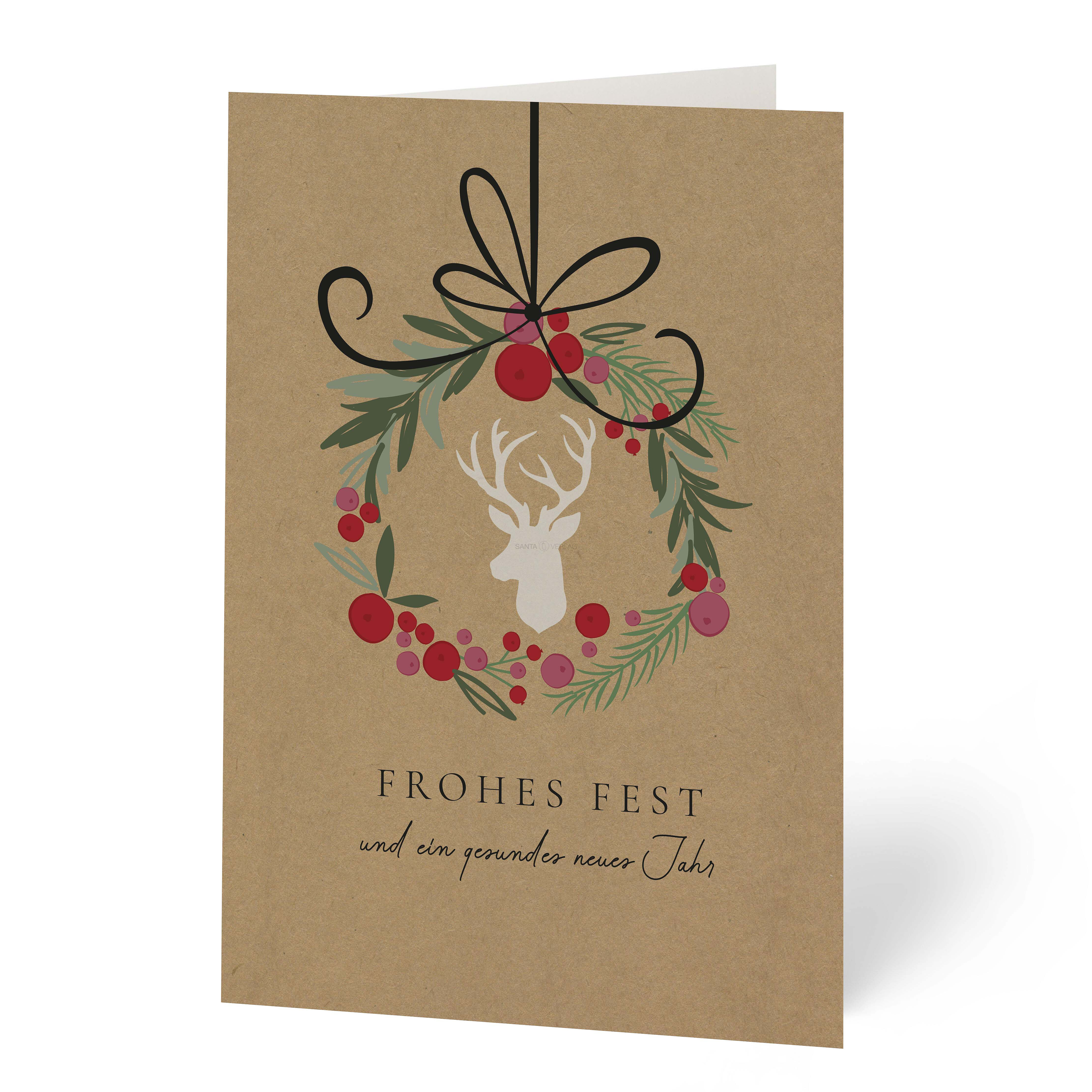 Weihnachtskarte mit stylischem Kranz im Kraftpapier-Look,hochwertiges Papier weiss matt
