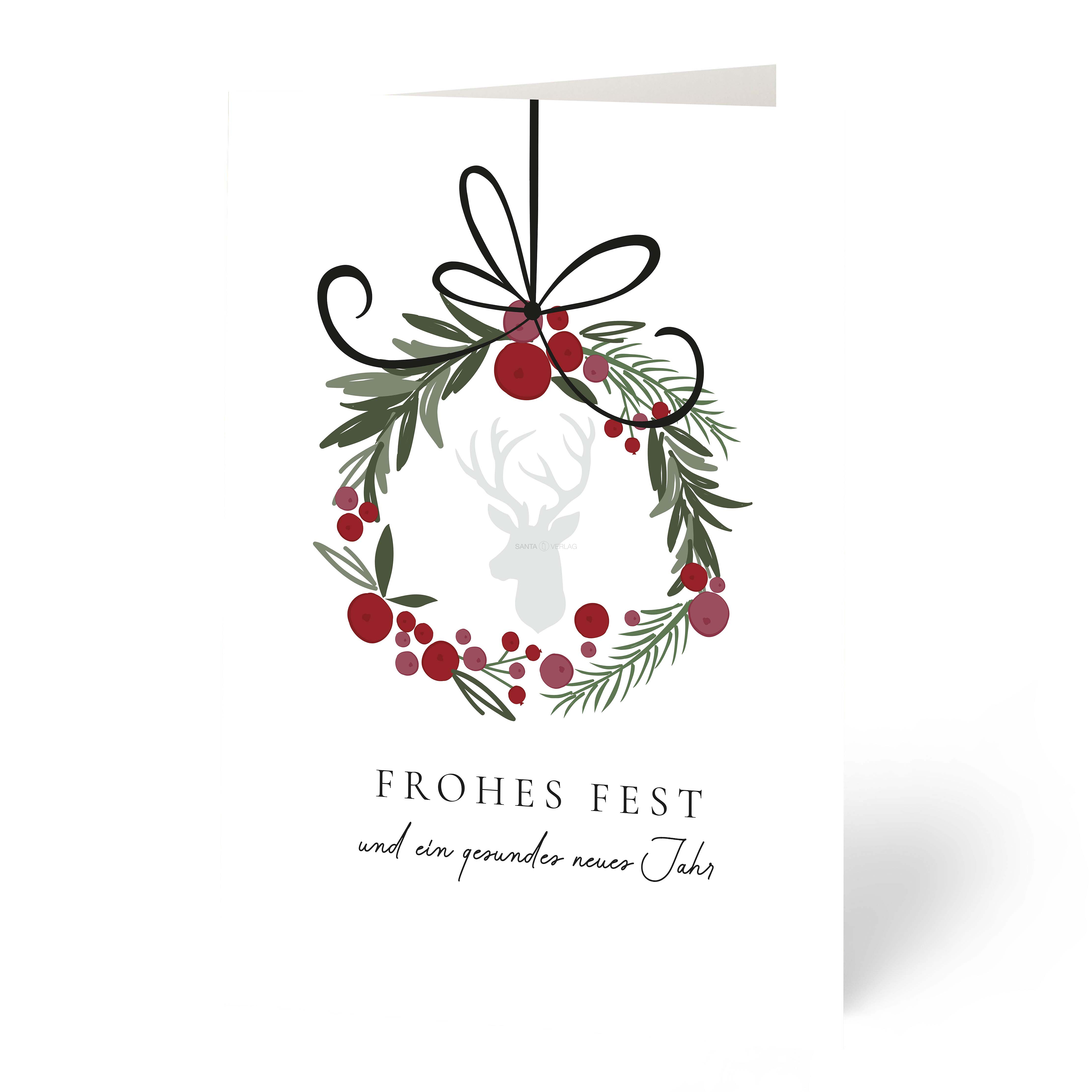 Weihnachtskarte mit stylischem Kranz und Hirsch,