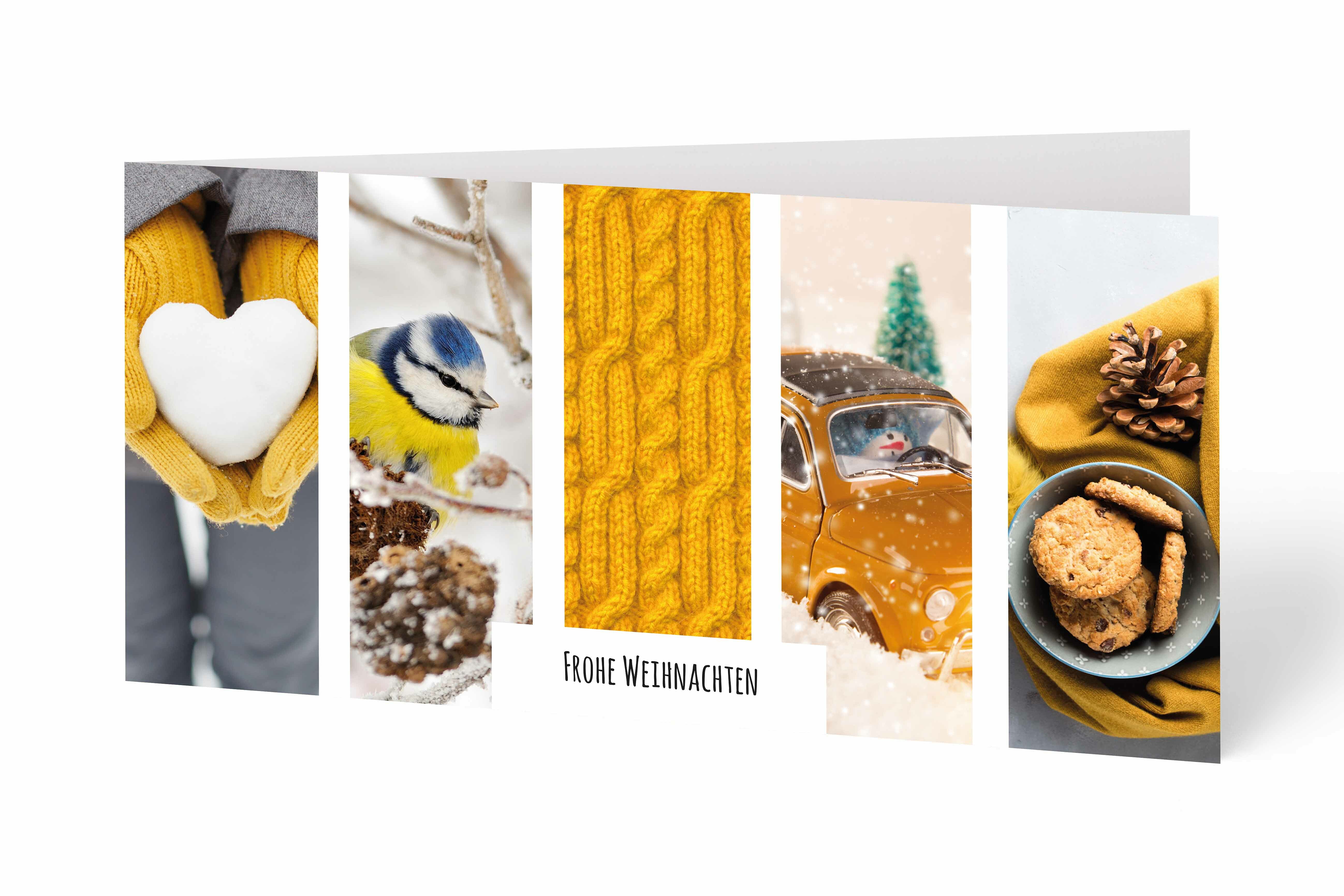 Weihnachtskarte, harmonische Bildercollage in warmen Gelbtönen