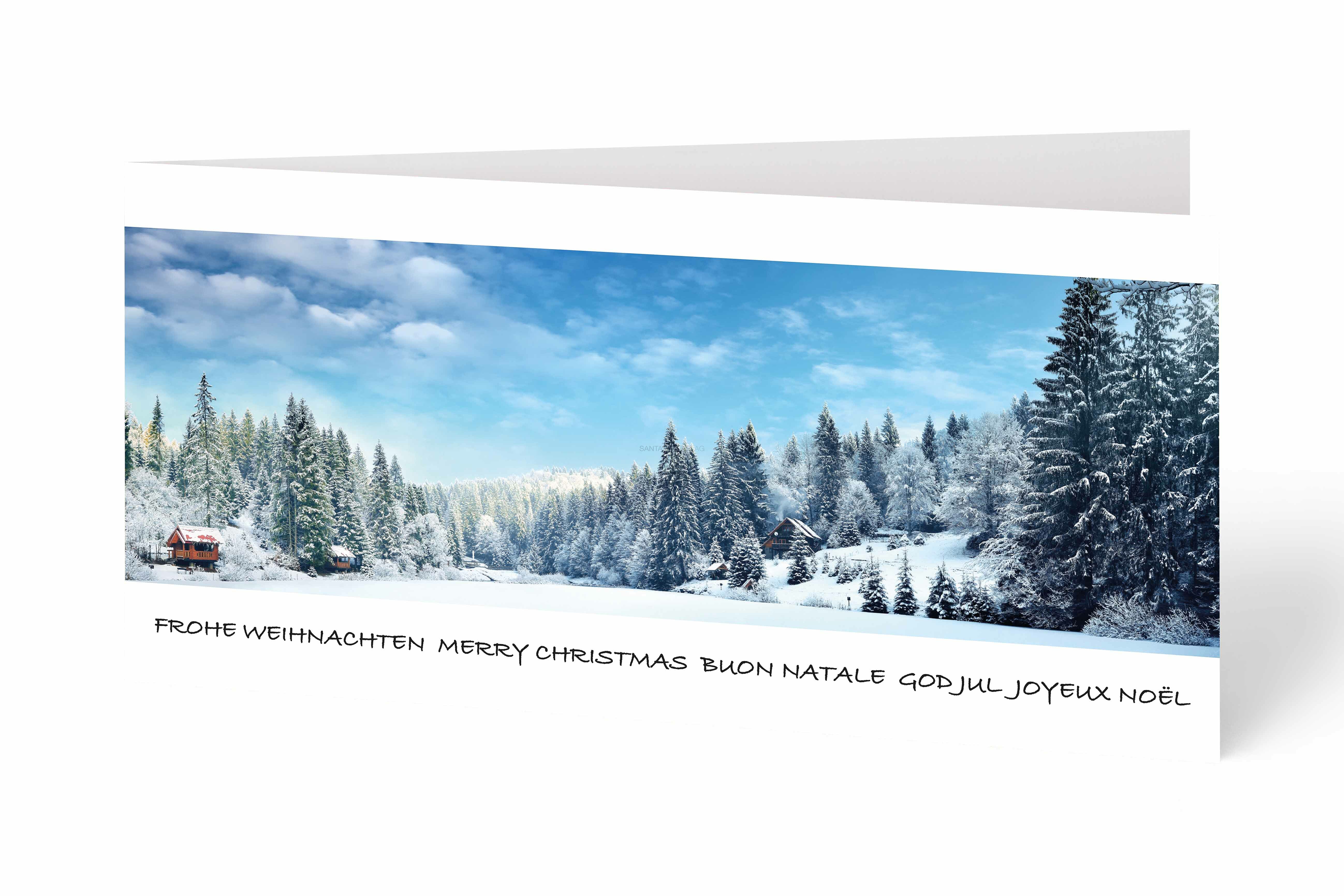 Weihnachtskarte, Internationale Weihnachtsgrüsse, klassisch verschneite Winterlandschaft - Bildausschnitt auf schwarzem Hintergrund