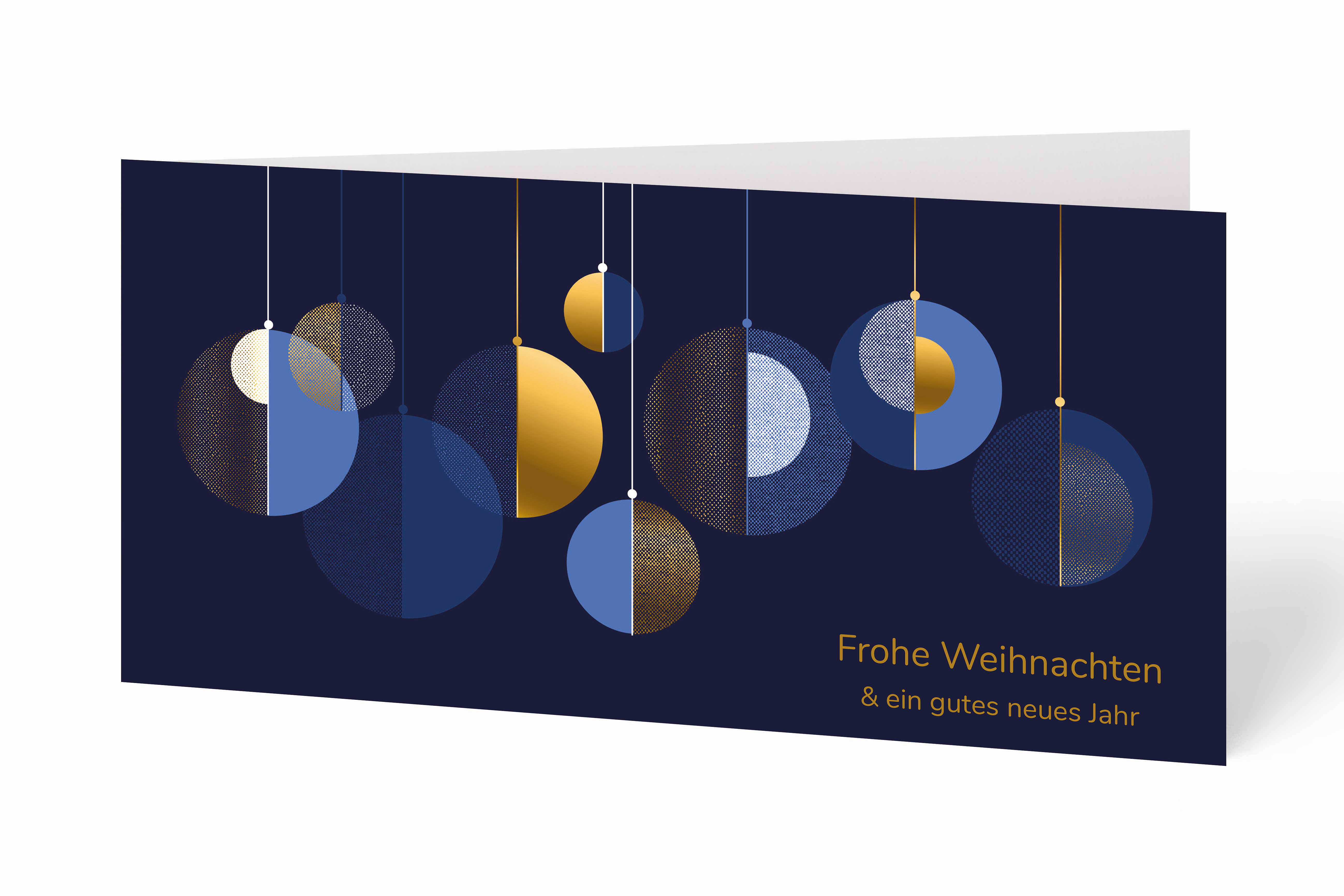 Weihnachtskarte, moderne Weihnachtskugeln auf dunkelblauem Hintergrund