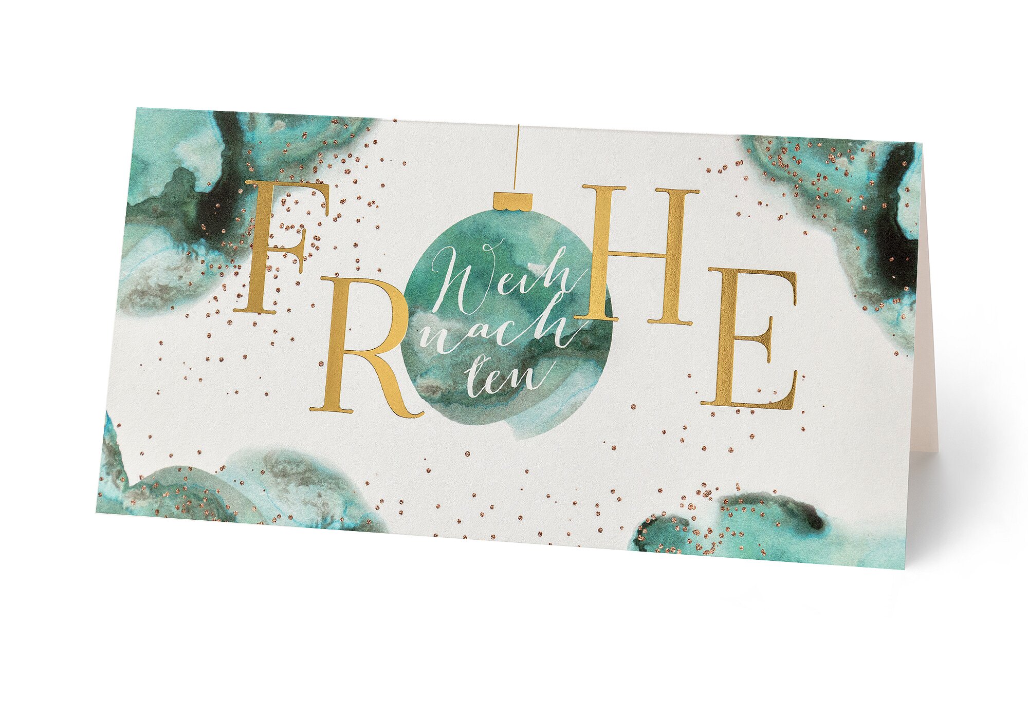 Diese Weihnachtskarte besticht durch weich fliessendes Blau. Das kräftige Gold setzt edle Akzente und strahlt Freude und Wertigkeit aus.