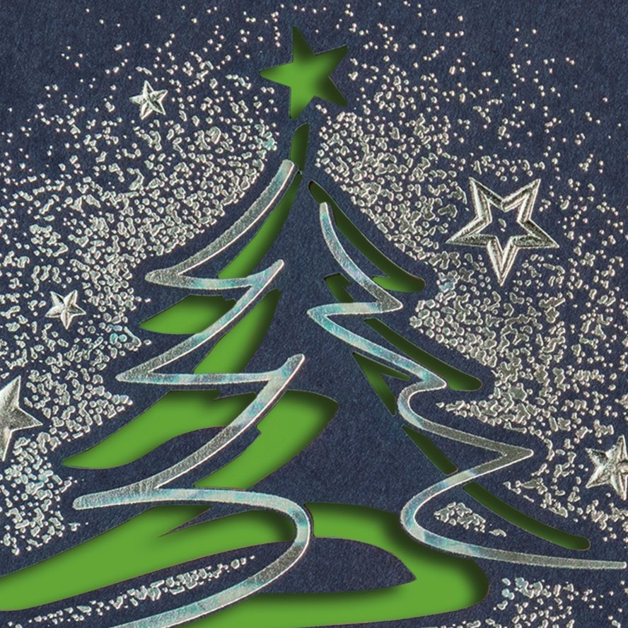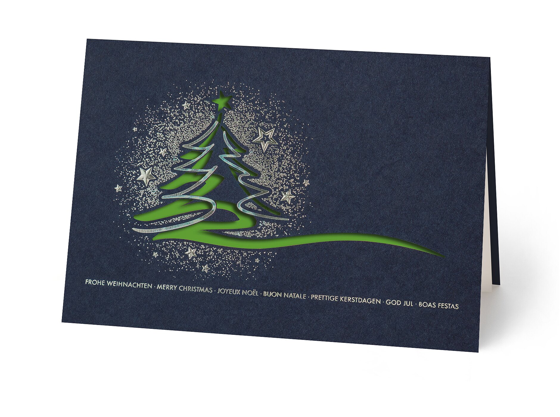 Mit dieser Weihnachtskarte bereiten Sie dem Empfänger international eine Freude, wenn dieser seine Weihnachtswünsche auf solch einer raffiniert gestanzten , mit hellgrünem Einlageblatt hinterlegten Karte erhält.